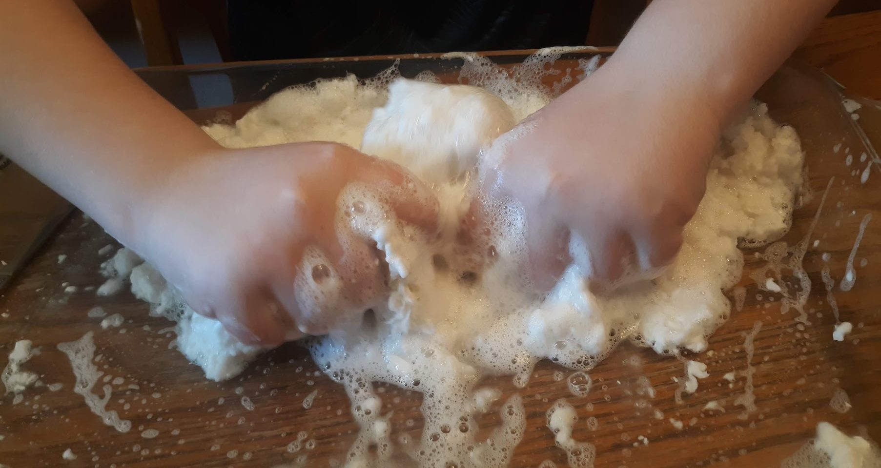 Make soap shavings by scraping a butter knife along the edge of the bar of a soap or using a grater. Make sure the flakes are small and fine. Most children 4 and up can do this on their own with a bit of direction and supervision.