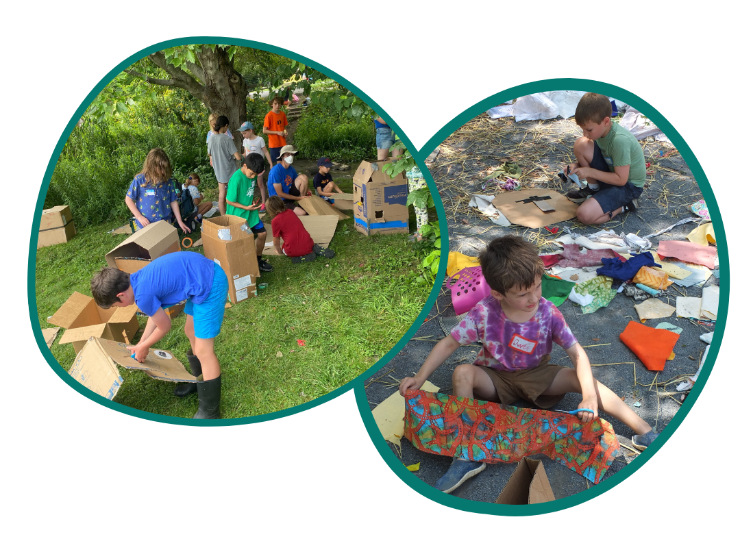 ICG provides a large collection of “loose parts” (cardboard, fabric, ropes, tubes). Children use imagination, internal motivations, and personal interests to transform raw materials into anything they can dream up — forts, costumes, instruments, sculptures, and more.