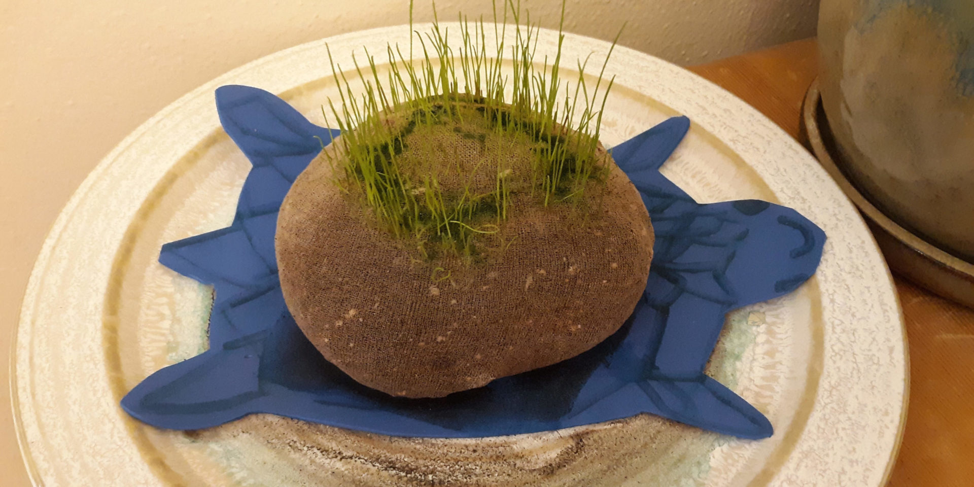 Put your damp “shell” on top of your foam turtle, making sure the seeds are showing at the top. If you’re using cardboard for your turtle, place your shell on a plastic lid first and then on your cardboard turtle. Set the turtle and shell on a plate to catch any water drips and find a place on a sunny windowsill.